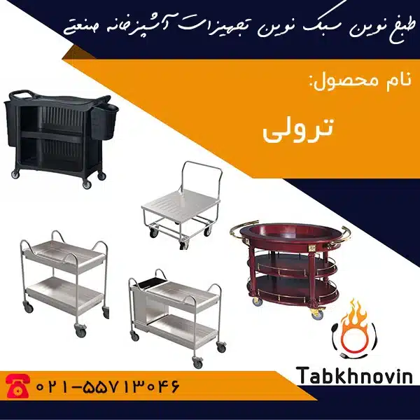 ترولی(trolley) در انواع مختلف برای آشپزخانه ها، رستوران ها، هتل ها و غیره به جهت حمل ظروف، سرو غذا، پذیرایی، جمع آوری ظروف کثیف، حمل چمدان،حمل مواد اولیه، حمل دیگ و غیره استفاده می شود که بر اساس نوع استفاده و کاربری آن، از جنس های مختلفی نظیر استیل، پل اتیلن و چوبی استفاده می شود. ترولی چوبی معمولا برای پذرایی و سرو غذا کاربرد دارد، ترولی های استیل معمولا در آشپزخانه هاص صنعتی و دارای ظرفیت طبخ بالا استفاده می شود و ترولی های پلی اتیلن در کترینگ ها و رستوران های کوچک استفاده می شود. در واقع یکی از تجهیزات لازم و ضروری در آشپزخانه صنعتی، استفاده از ترولی یا ترالی می باشد که حتما در اشپزخانه به آن نیاز خواهیم داشت.